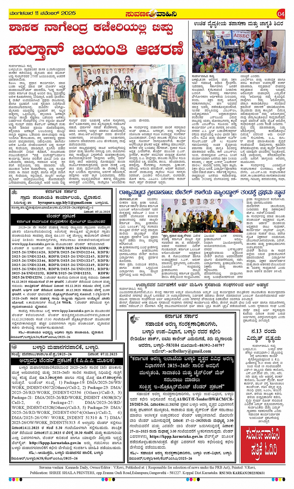 11 ನವೆಂಬರ್ 2025 Suvarna Vaahini Page: 4 November 11, 2025 << First << 4 >> Last >> Page 1Page 2Page 3Page 4 × 11 ನವೆಂಬರ್ 2025 Suvarna Vaahini page-1page-2page-3page-4 << First << 4 >> Last >> page-1page-2page-3page-4