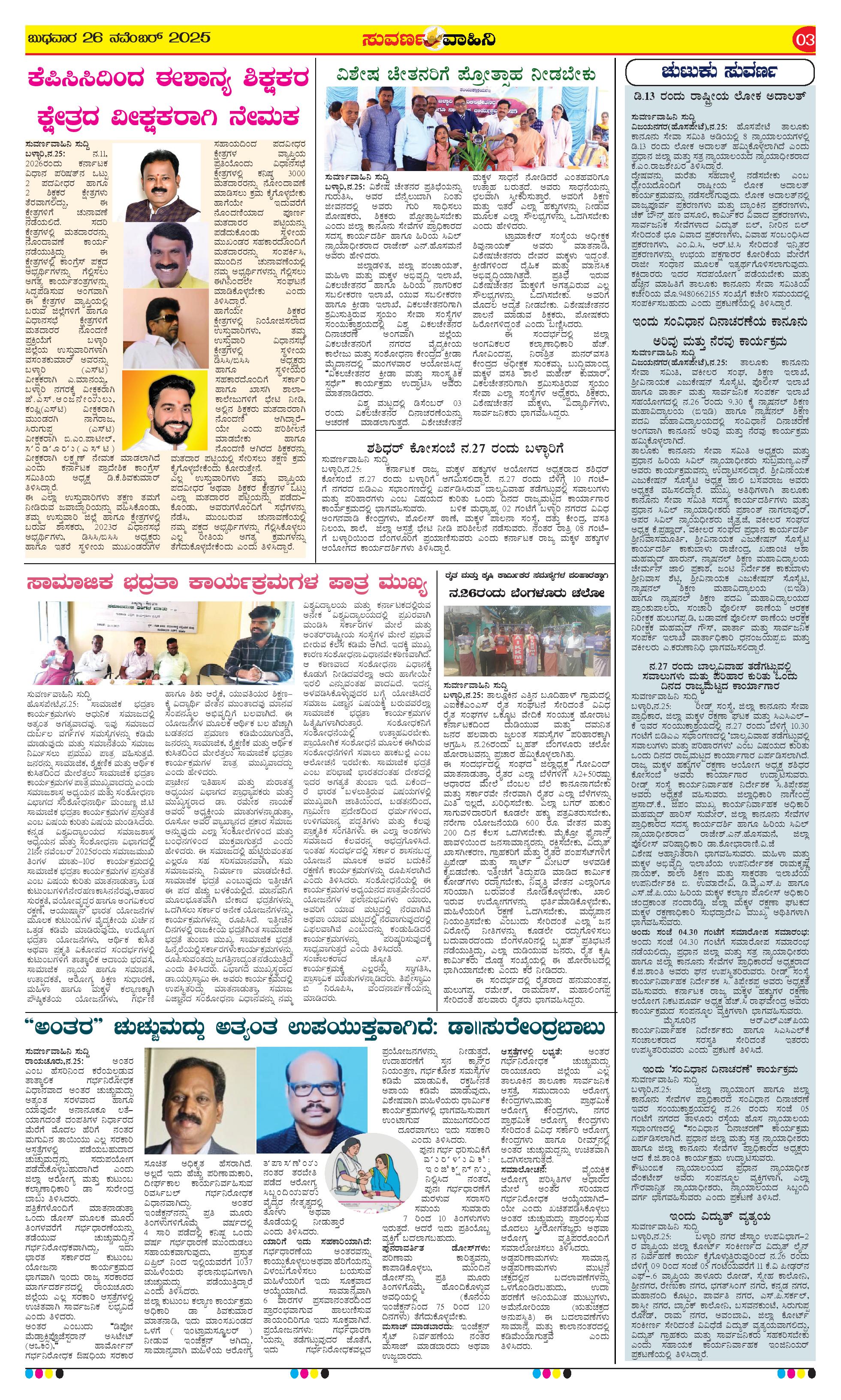 26 ನವೆಂಬರ್ 2025 Suvarna Vaahini Page: 3 November 26, 2025 << First << 3 >> Last >> Page 1Page 2Page 3Page 4 × 26 ನವೆಂಬರ್ 2025 Suvarna Vaahini page-1page-2page-3page-4 << First << 3 >> Last >> page-1page-2page-3page-4
